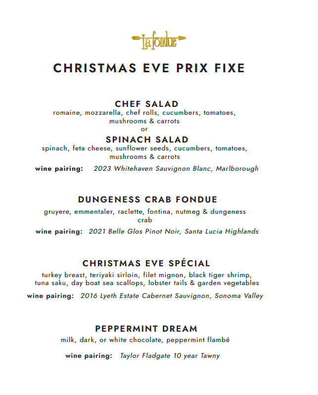 - Fondue Feast – A fully customizable 4-course tasting menu featuring three meat selections per guest | 88 per guest.